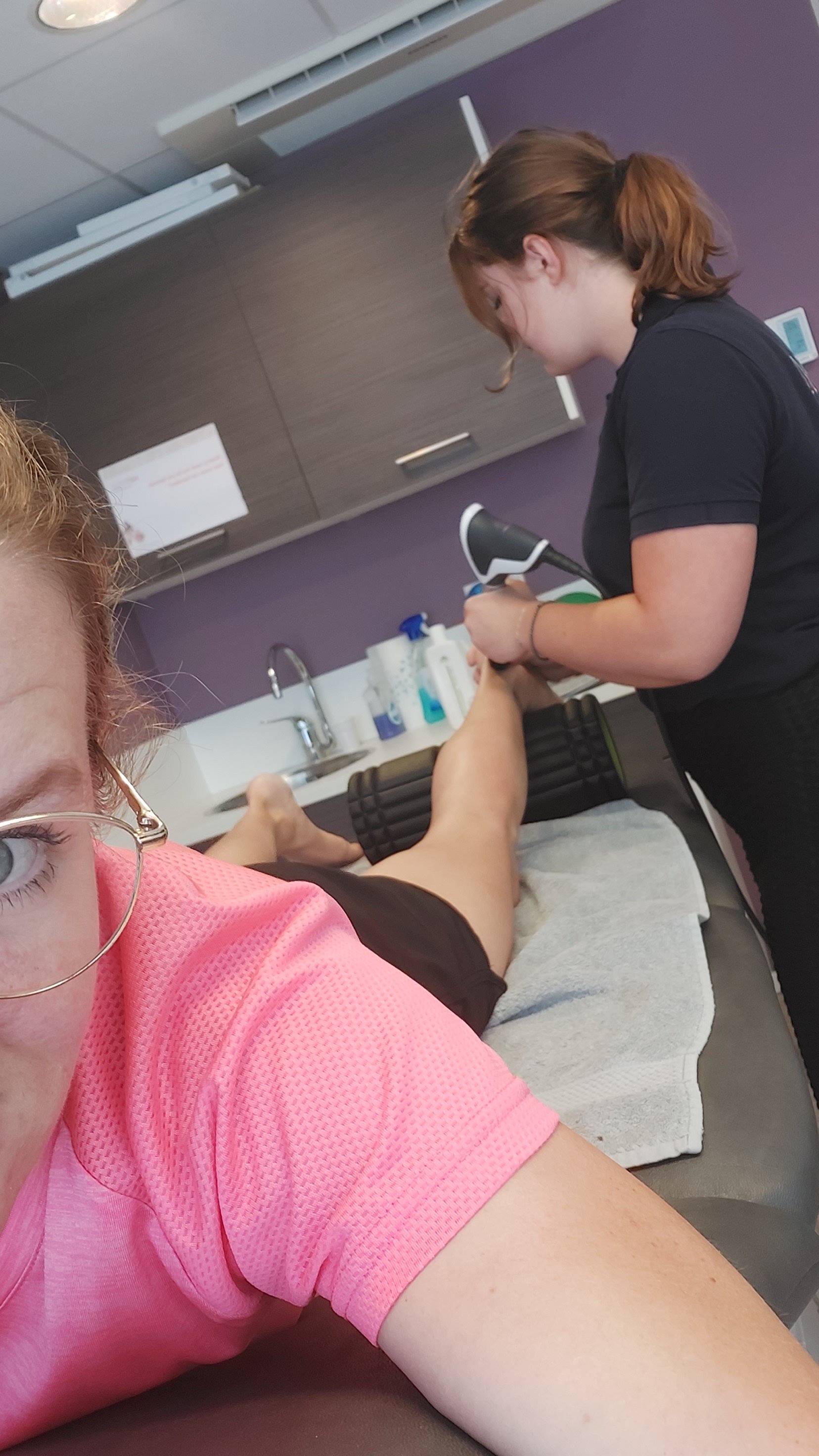 Als ik eens terug kijk, denk ik dat ik gewoon al heel lang met dit pijntje zit. Het gaat steeds weg, maar komt ook steeds weer terug. Als het weg is kan ik weer trainen toch? Maar na een tijdje was het daar dan weer. Ik heb een tijdje een logboek bij gehouden en daar is ook goed te lezen dat het er ongeveer een jaar geleden al was. Toen kwam dit jaar ook corona om de hoek kijken en ook weer dat pijntje, ik had behoorlijk wat stress van alles wat er gebeurde rondom corona. Ik woon eigenlijk wel in de brandhaard van corona zullen we maar zeggen. Ik liet daardoor het lopen ook wat zakken, en mijn motivatie was ook even weg. Er waren geen wedstrijdjes dus waarvoor zou ik me druk gaan maken. Ik gaf dat pijntje eens wat meer rust dan ik normaal zou doen. Naar een fysio gaan kon nu ook even niet. Ik gaf het 2 weken rust in de hoop dat het nu echt weg zou zijn. Helaas na een paar loopjes was het daar weer. Nog steeds kon ik niet naar een fysio en rommelde zelf maar weer wat aan. Toen eenmaal de fysio deuren weer open gingen heb ik nog steeds 2 weken gewacht om te gaan, ik durfde het gewoon nog niet. Toen ik er zelf wat rustiger onder was besloot ik er nu echt wat aan te gaan doen. Het perfecte moment om dit aan te pakken, er zijn nu even geen wedstrijden dus ergens klaar voor maken zat er toch even niet in. Door een trainingsmaatje en zelf ook fysio (Marlijn) kwam ik terecht bij NXT Fysio. Ik liet een echo maken en daar was gelukkig niet iets heel ergs te zien, wat vocht en irritatie bij de aanhechting van de achillespees. Mijn achillespees was ook al een tijdje erg stijf, dus dat het daarmee te maken had had ik wel verwacht. Geen scheurtjes of iets dergelijks en dat was goed. Er werd ook gesproken over een chronische pijn. Dat was goed te behandelen met die shockwave therapie. En zo had ik al een week later mijn eerste shockwave therapie behandeling.